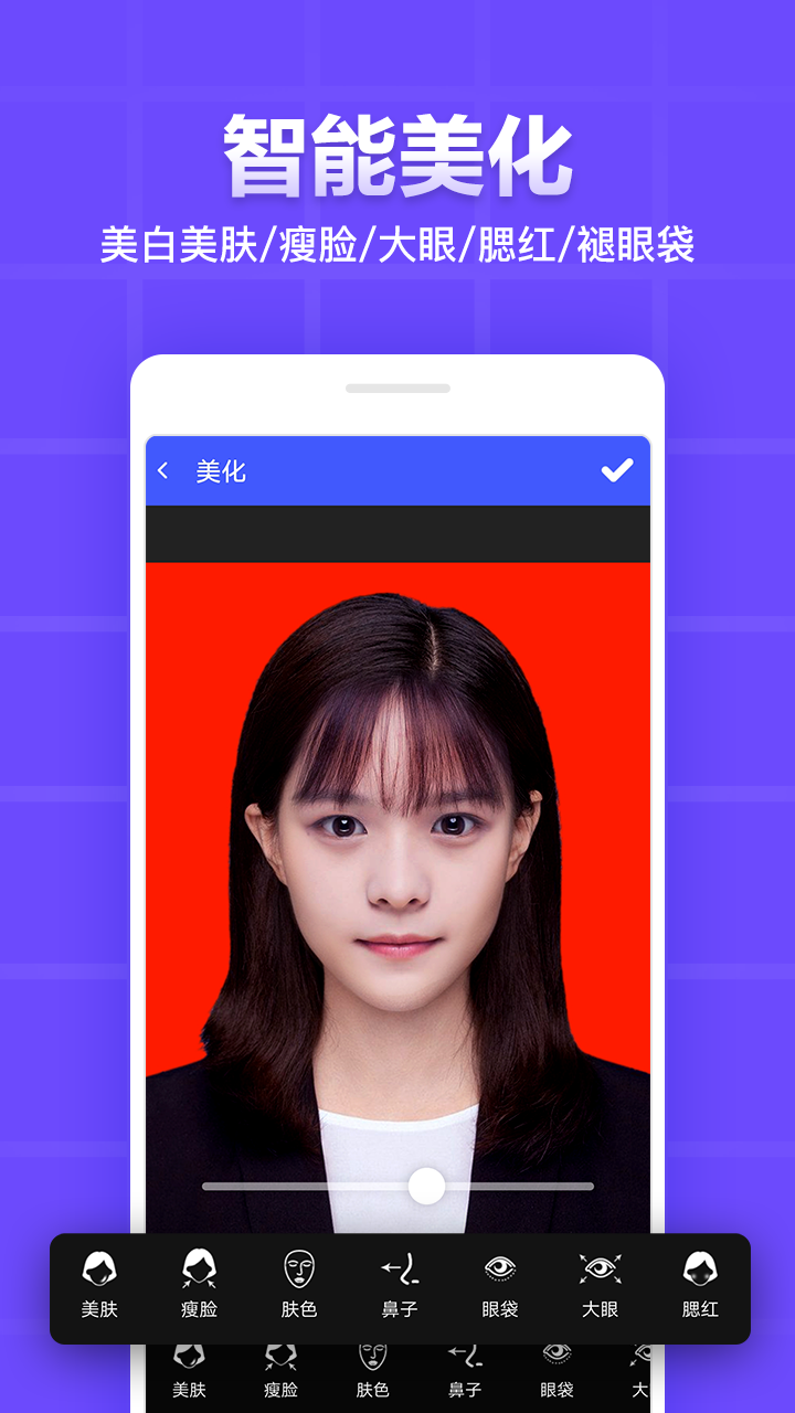 优化美颜算法,一键美颜美白,真实又美丽。素颜的也能拍出美美的证件照。