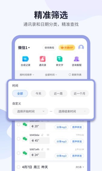 2、[语音筛选]可以根据不同的用户对语音进行分组,以有效地管理微信好友的语音留言,还可以根据时间进行过滤,以在一定时间段内快速查找好友的语音留言。