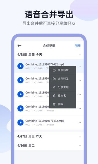 3、[语音导出]您可以选择所需的语音,只需单击一下即可将其合并并导出为单个MP3文件,从而使工作和学习变得更加方便。