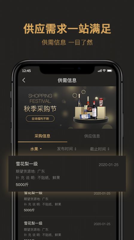3、全面升级,精选全球商品尊享品质生活,新鲜食材一站购齐,分类齐全 应有尽有,生鲜蔬果有保障,新鲜平价放心购,供应需求一站满足,供需信息 一目了然。
