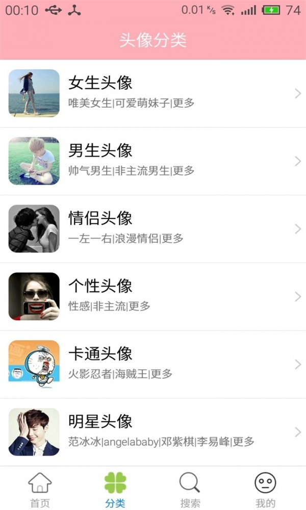 1、软件首页当中包含了男生女生头像以及情侣头像和卡通头像等等。