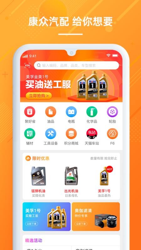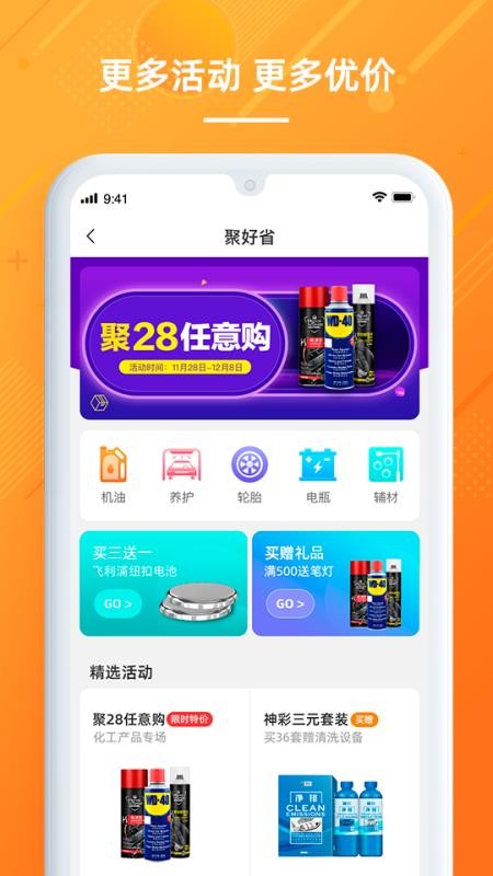 1、汽车配件丰富,包含油品、轮胎、易损件、工具辅材、化工养护等。