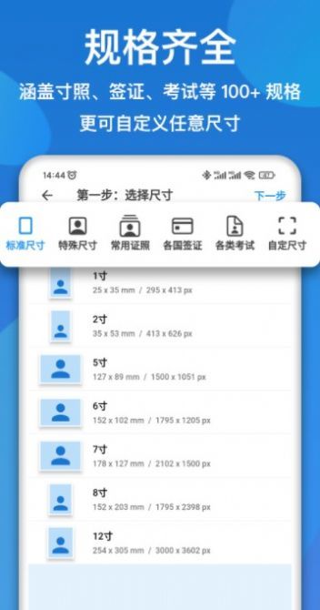 1.涵盖了标准尺寸、常用尺寸、常用证照、各国签证、各类考试等多个品类