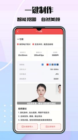 1、一键制作,极速最美证件照App就是为了给用户提供便利,界面中有一键制作按钮,导入照片后点击自动帮你生成