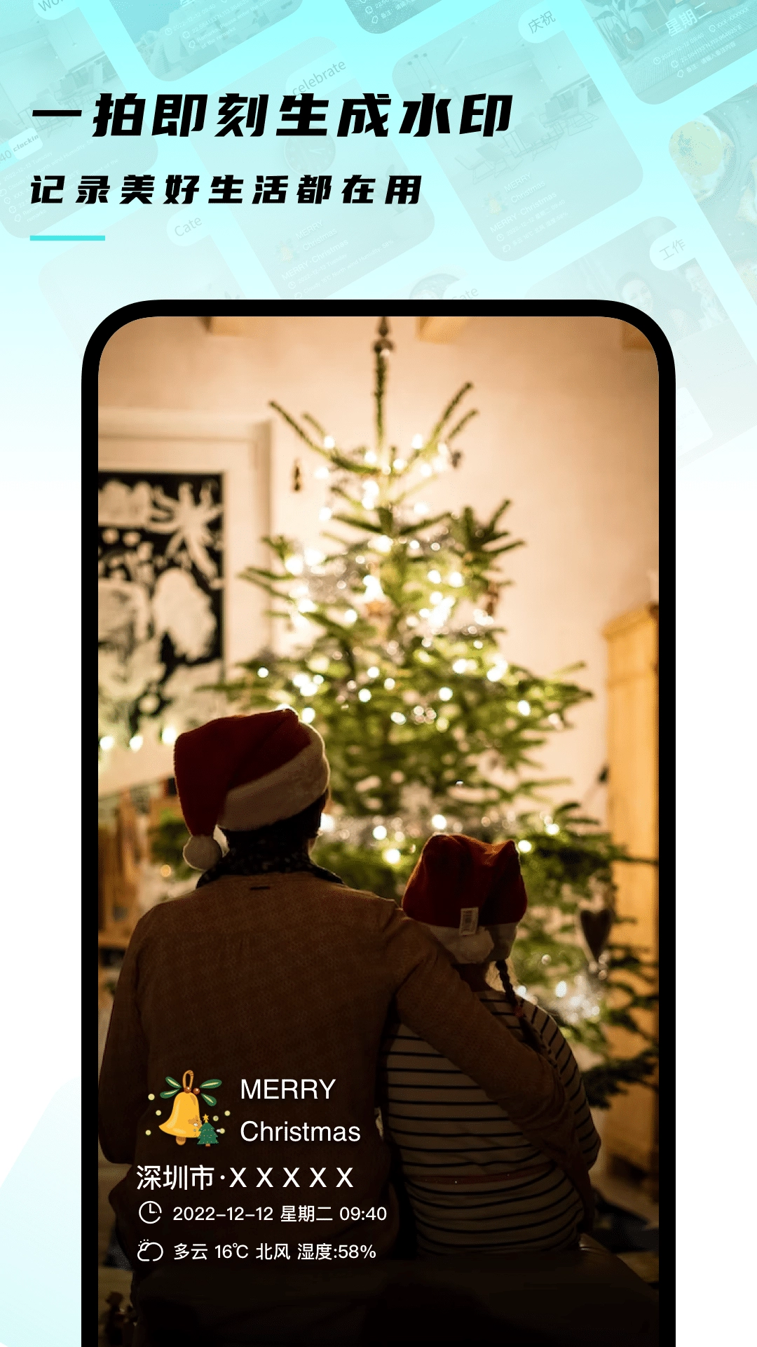 1、智能的水印模版:天气、地点、时间、分贝、海拔、速度,智能水印自动添加到照片上。