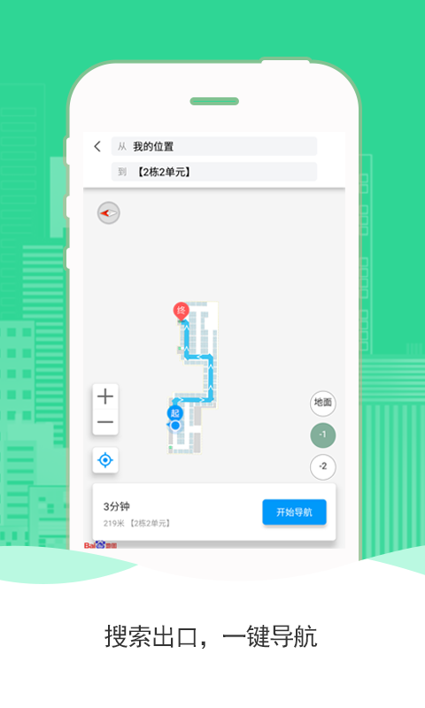 找出口----停车场出口一目了然,推荐就近路线;