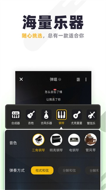 1、弹唱神器:提供钢琴,吉他2种乐器弹唱。