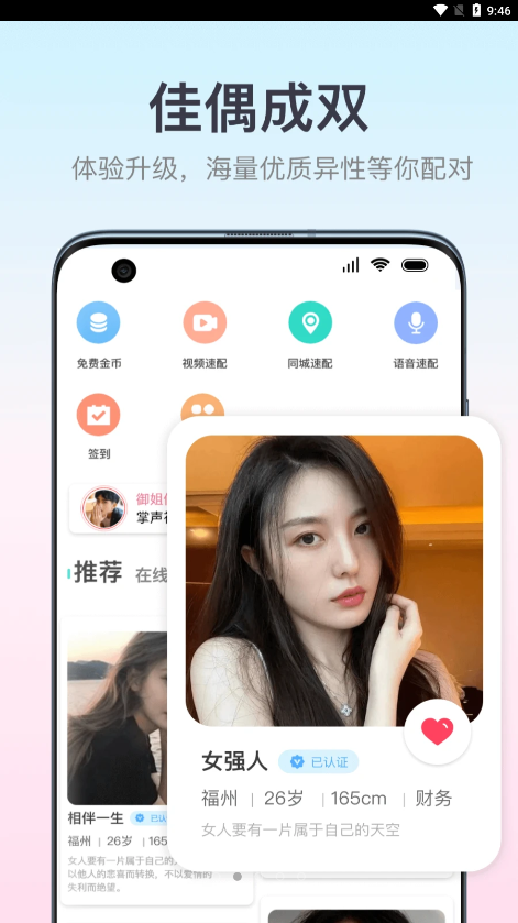 佳偶成双是一款主打实名聊天与匹配的社交应用。应用真实匹配,不用担心聊天室机器人回复,精准匹配算法进行用户推荐,使交流高效。在这里,你可以随时认识身边有趣的人,帮助单身男女找到自己的理想对象,实时在线互动,总有一个TA愿意陪伴你,来佳偶成双,认识更多朋友找到属于你的佳偶。