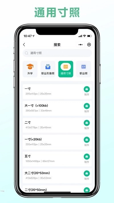 一寸、二寸等常用寸照;英语四六级、普通话水平测试等语言考试;计算机等级考试;公务员、事业单位考试;社保证、身份证等身份证件;还可以拍摄结婚登记照、职业形象半身照,满足证件照制作的所有场景。