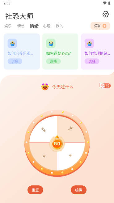 社恐大师是一款非常好玩有趣的趣味做决定软件,为用户提供有丰富的抉择功能,抽签、转盘、抓阄等趣味选择,提供社交恐惧症患者的个人情况分析,以及心理训练、行为干预等方案,从而降低社交恐惧症引起的焦虑和压力。