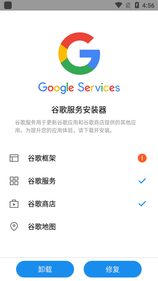 谷歌服务安装器是一款用于在Android设备上安装谷歌服务的工具,软件支持安装谷歌四件套,包含了谷歌服务,谷歌商店,谷歌框架和谷歌地图,手机没有的或者是文件损坏的可以帮你快速恢复,还有谷歌框架安装、谷歌数据同步等功能,功能十分全面,免费下载安装使用吧!