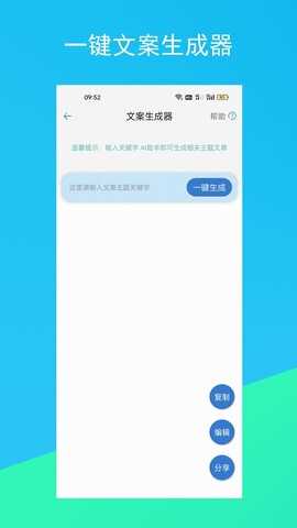 文案生成器App是一款非常实用的手机应用程序,可以帮助用户快速生成高质量文案,节省用户的时间和精力。该应用程序提供了多种模板和样式,用户可以根据自己的需求选择合适的模板并进行修改。同时,文案生成器App支持离线使用,方便用户随时随地使用。总之,如果你需要撰写文案,那么文案生成器App是一个不错的选择。