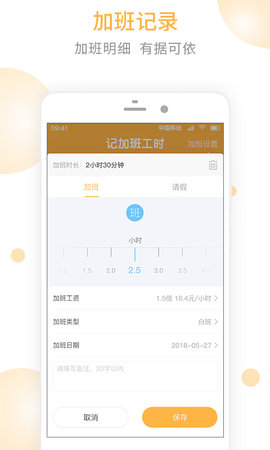 能自定义记录考勤周期,支持设定工作日时间、平时加班、周末加班、节日加班工资倍数,是值得拥有的考勤助手,让您天天轻松记加班。