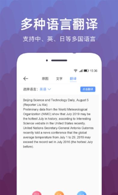 可将图片中的文字进行翻译,可识别翻译中文、英文、粤语、文言文、日语、韩语、法语、西班牙语、泰语、阿拉伯语等