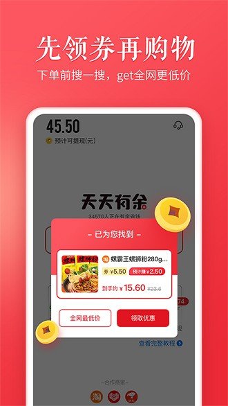 天天有余app是一个非常给力的线上购物商城,用户可以直接搜索想要购买的商品名称,就会出现相对应的商品和优惠券,基本上每一款商品都可以领取到一张劵,不同的商品活动力度会有所不同,海量的优惠券随意领,又为我们省下了一笔不小的购物资金。