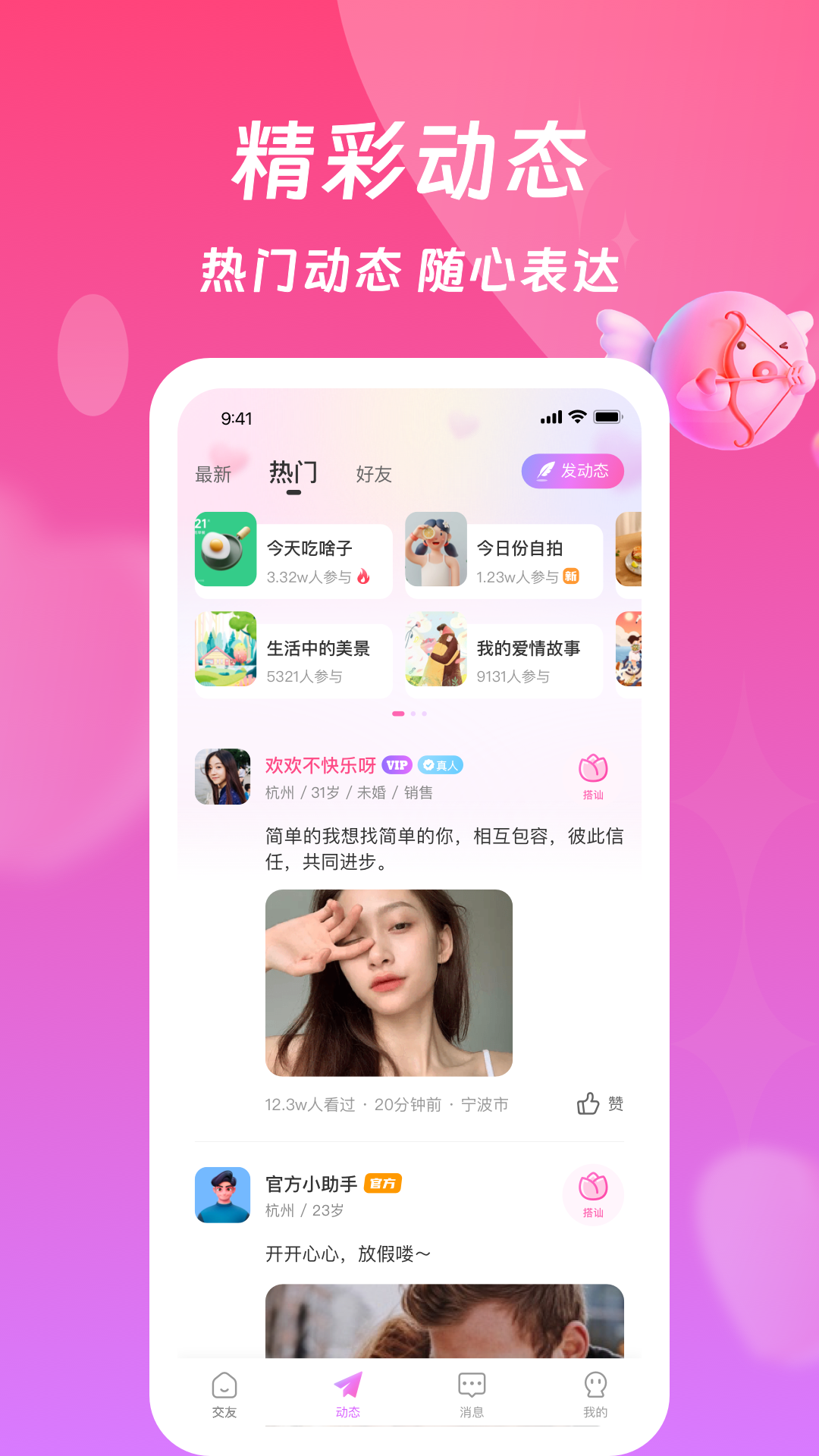 使用“动态广场”功能了解最新的社交动态。