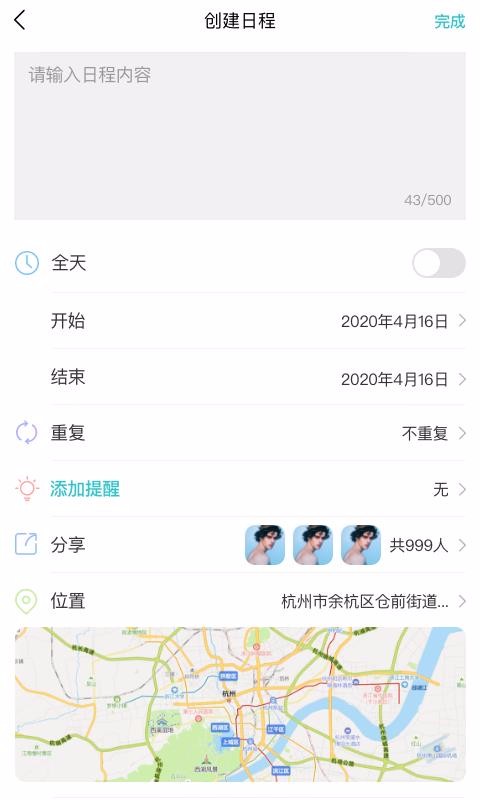 4、在创建日程过程中可以添加位置信息,自动根据定位显示当前的位置;