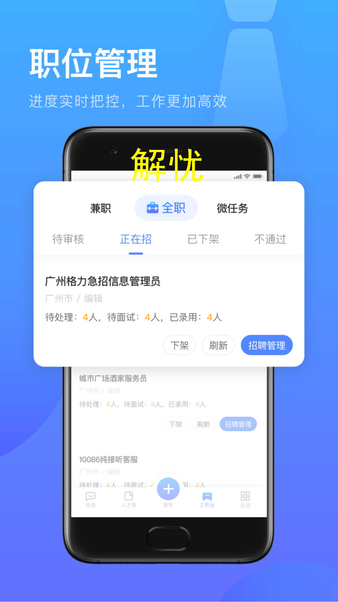 1、发布多种类型的职位信息,包括全职、兼职、实习等各种职位,以满足企业招聘的多样化需求;