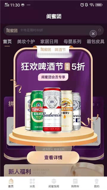 闺蜜团,狂欢啤酒节五折起,生活日常用品,美食饮品,超多优惠商品,全网平台中搜集而来,在这里你可以搜索自己想买的商品名称内容,在商品列表中快速查看预览小图,从而进行个性化选择,个人中心中还可以轻松于此查看自己的购买记录。
