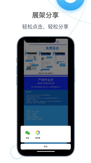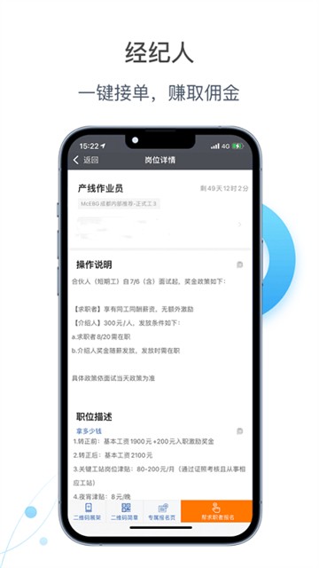 2、推荐朋友:包含职位介绍,接单报名,二维码展架等功能。