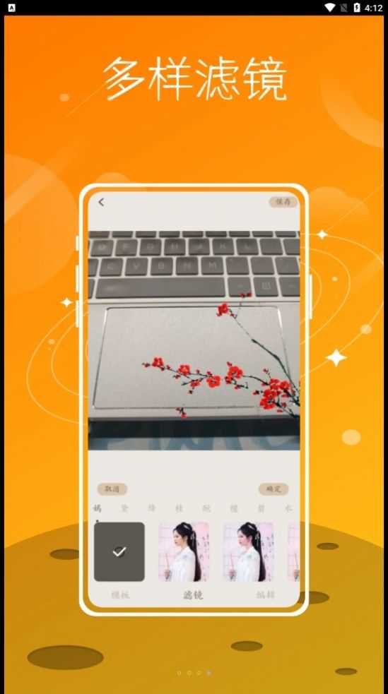 文泓古装相机是一款让用户能够在照片中穿上传统古装并拍摄美丽照片的相机应用。同时,软件还提供了多种修图编辑工具,包括裁剪、调整亮度、对比度等功能,帮助用户调整照片的细节和色彩,使得照片呈现出更好的视觉效果。