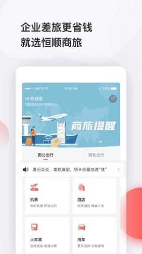 恒顺商旅App是一款专为商务人士出差旅行提供便捷服务的应用软件。用户可以通过该App预定机票、酒店,安排租车以及管理行程等功能。