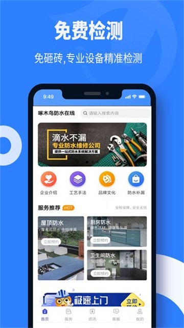 啄木鸟防水app属于一款专业做防水补漏的平台,旨在为用户解决生活中的各种问题,如防水补漏,墙面翻新,水电维修,管道疏通等,根据不同的房屋结构,制定出详细的防水补漏方案。