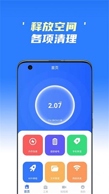 这个软件的首页有很多的功能,除了大家常见的加速,还有省电模式,它还能够让我们对网络进行测速,如果觉得当前的网络速度不太给力,就可以选择连接一个其他的网络,同时如果手机的温度过高,也可以通过这个软件对手机进行降温,从而使手机处于一个快速的运行状态。
