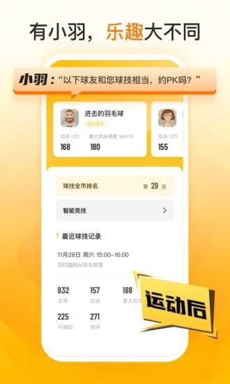 - 组局:“小羽”有学习能力,越来越懂你,感知你什么时候想打球,会事先自动帮你约人订场,组织你和你的好友去打球,让你多打球