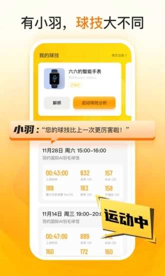- 球技分析:通过智能手表启动羽约运动,“小羽”会精准记录分析你的每一次挥拍,为您提供专业球技报告,哪里需要提升一目了然