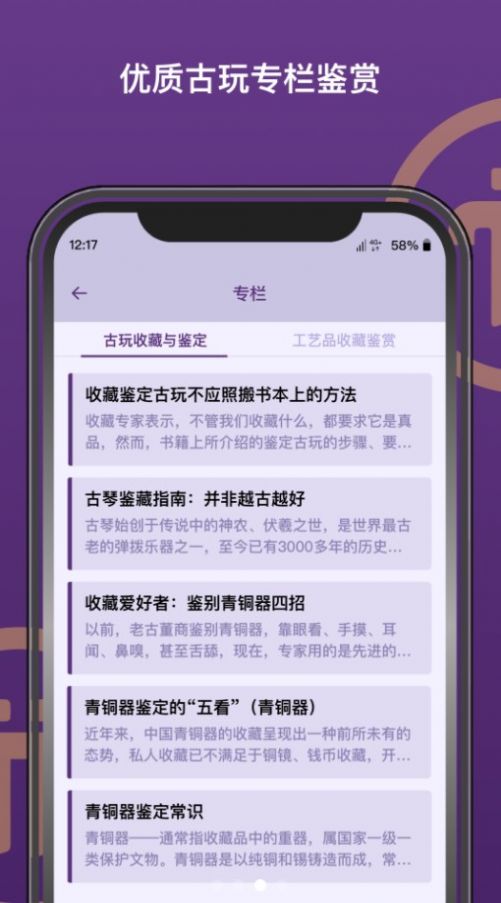 1、app上有古玩欣赏、鉴别知识、大师讲解、藏品展示等功能;
