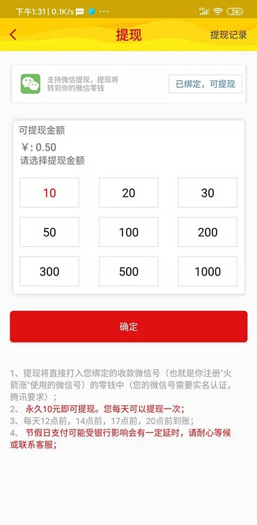 2、在火箭涨上赚到的奖励够10元就可以把奖励申请提现出来,提现申请后会在24小时到账