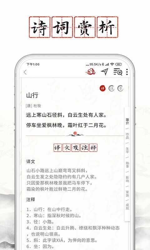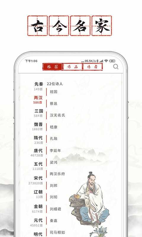 1、打开软件进入主页庭院,有许多熟悉的古人,例如李白、杜甫、李清照、辛弃疾、苏轼等,他们吟诵几句经典,点击进去会跳转相关词句解析