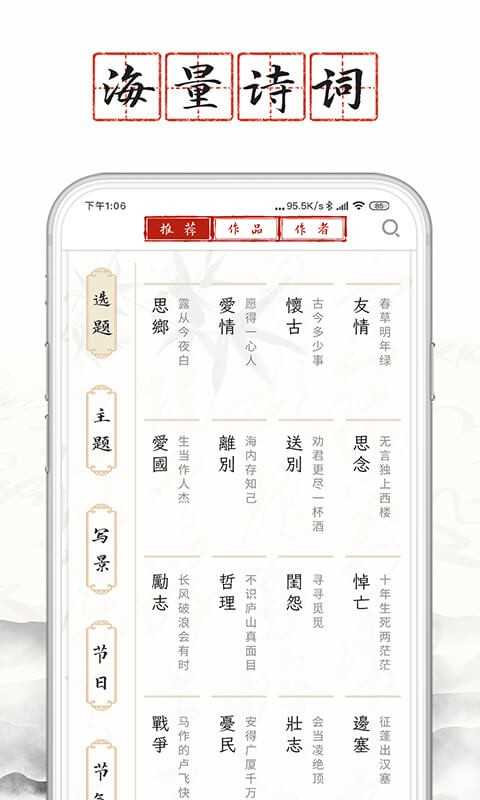 3、推荐界面会有诗词推荐,你也可根据作文、取名、摘录、祝福分类来查看