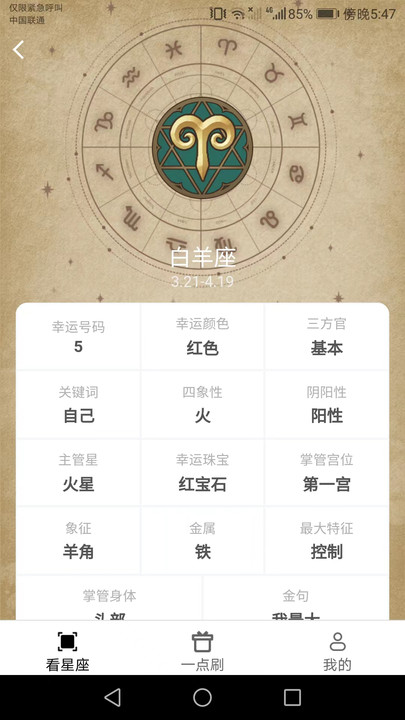 是一款基于星座运势的社交情感管理APP,为用户计算生成专属的每日占星运势。使用快看星座可以方便知晓自己和好友的每日状态,并提供情绪预警提醒。