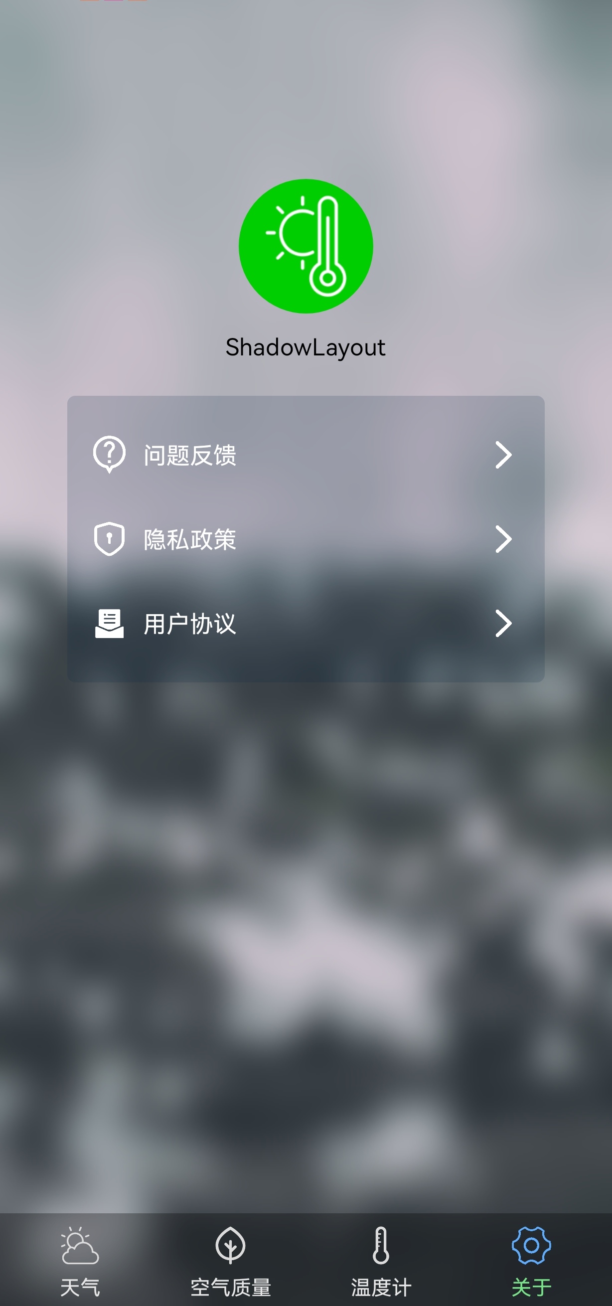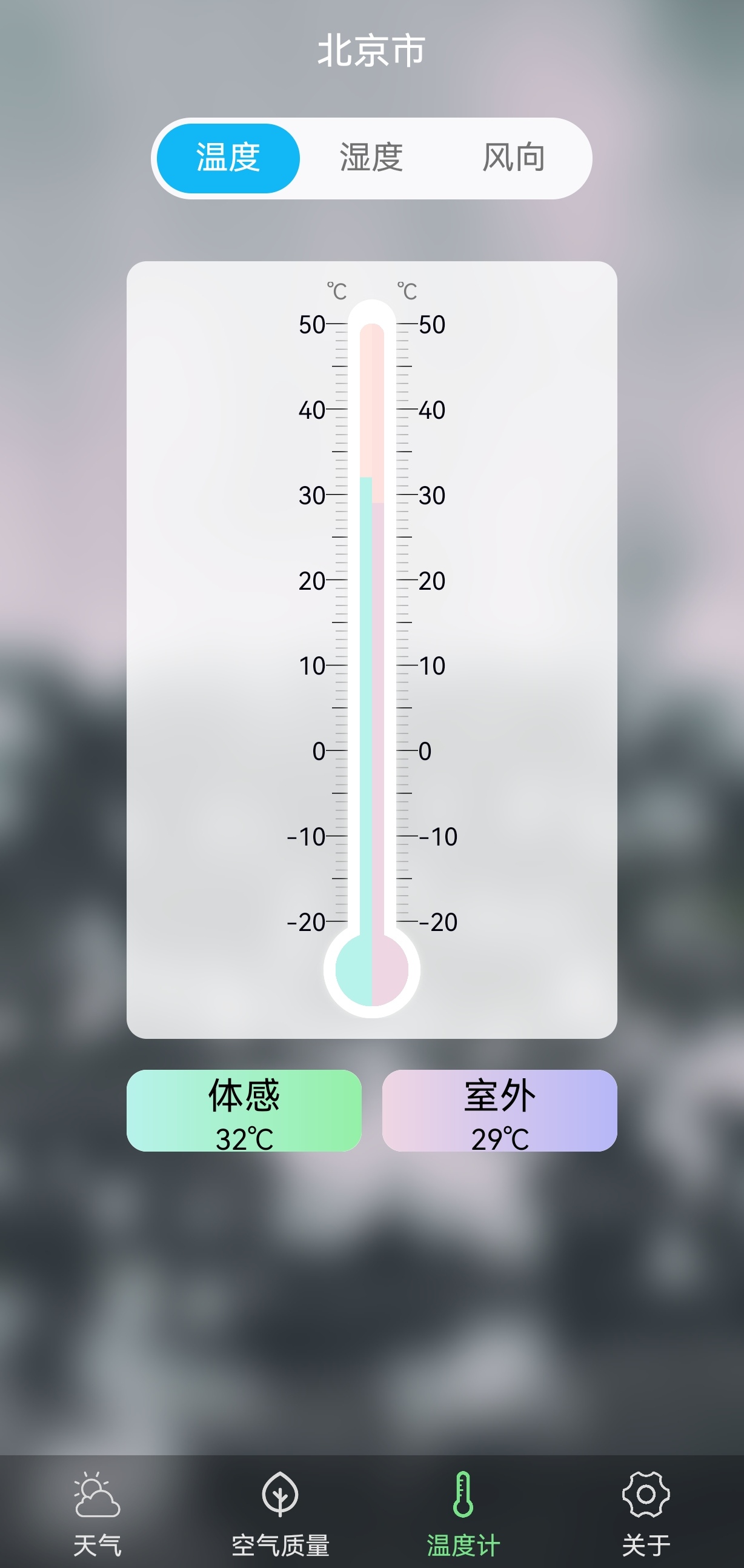温度计:gps定位当前所在地,显示温度、湿度、风向、空气质量,也可手动添加查看其他城市温度情况。