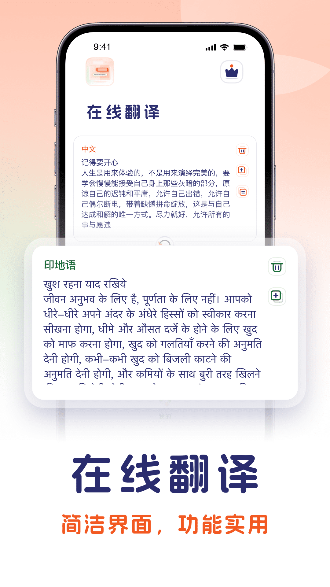 印地语翻译app是一款专门用于印地语翻译的移动应用软件,印地语翻译App可以帮助用户将印地语文本翻译成其他语言,或将其他语言的文本翻译成印地语,用户只需输入或粘贴需要翻译的文本,选择相应的源语言和目标语言,应用会迅速完成翻译并显示结果,这有助于用户在跨语言交流,学习或阅读时更好地理解和沟通。