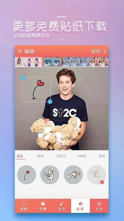 2、不仅能在该剪辑页面中剪切段落,还能给视频添加上精美的滤镜特效,或在某段中添加上特殊的趣味贴纸。