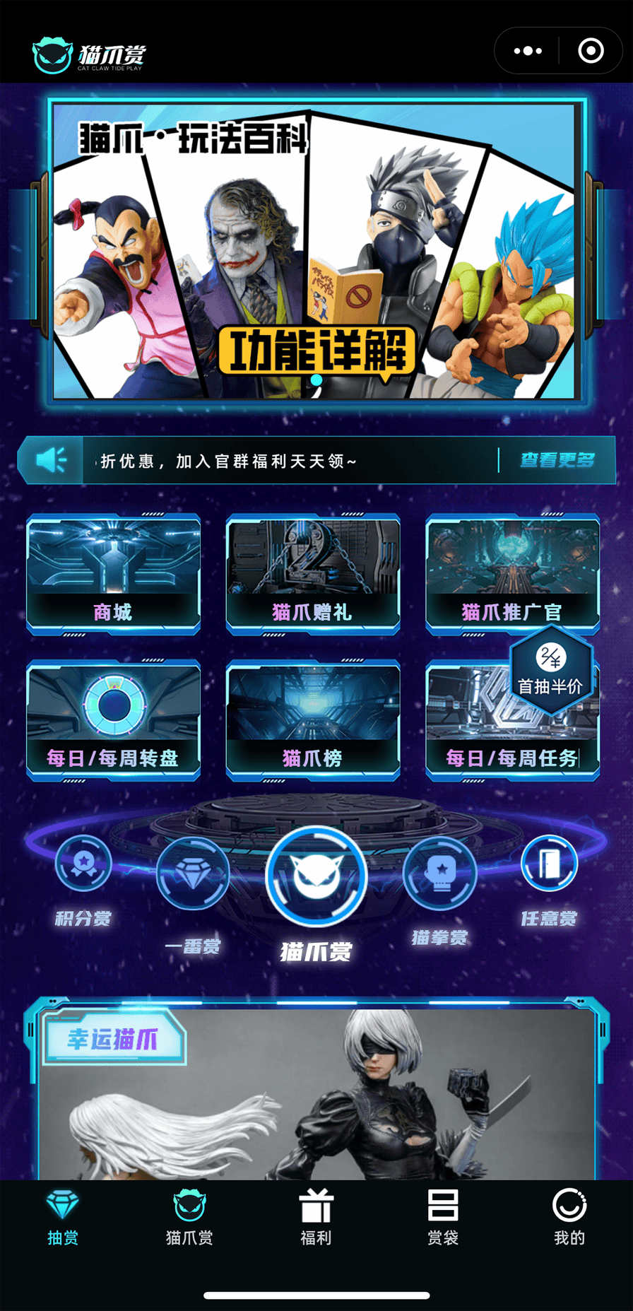 猫爪赏app是一款提供正品手办玩法详解的多功能盲盒商城,猫爪赏app涵盖了各种炫酷的二次元动漫手办,大量造型别致的潮玩好物可以在这里轻松购买,更多宝藏盲盒商品可以在猫爪赏商城下单购买。应用中常常会有限时特惠和促销活动,用户可以享受折扣和优惠价格购买心仪的商品。猫爪赏App会及时通知用户关于热门促销,让用户把握购物机会。