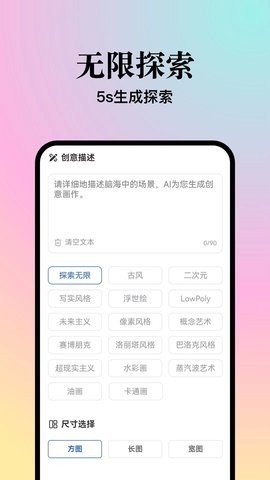 输入关键词,APP里头的AI技术能您的想象力,将枯燥无味的关键词瞬间变成创意十足的画作。