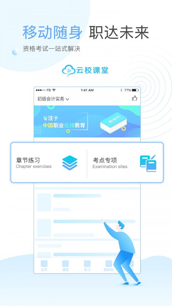 云校课堂app是一站式在线教育学习应用。云校课堂app提供众多职业考试培训课程,支持一站式刷题、听课,满足数百万职业考生需求,真正做到随用随学。该软件主要覆盖会计类、金融类、工程类、公务员事业单位、医学类、八大员等众多热门考试课程。用移动学习的方式学习课程知识,让大家都能够充分的将闲暇的时间利用起来。