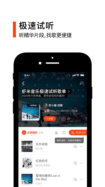 1、延续了虾米音乐的特色界面风格,还带来了全新的极简风格界面,给你最不一样的音乐播放体验。