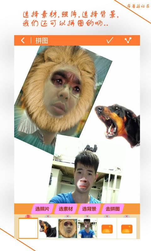 拼图部分可以把照片拼接在一张图片上,也可以选择你的搞怪图片,并提供精美素材。