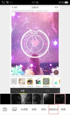 曝光- 亮度- 对比- 饱和- 晕影- 胶片颗粒纹理- 旋转和翻转- 锐化- 温度- 阴影