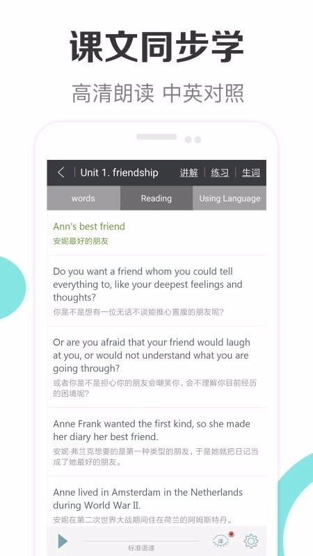 3、建议上课学英语没有完全学会的同学用,非常好用,和教材完全同步,还有习题,还自动生成错题本,阅读理解完形填空作文什么的都有。