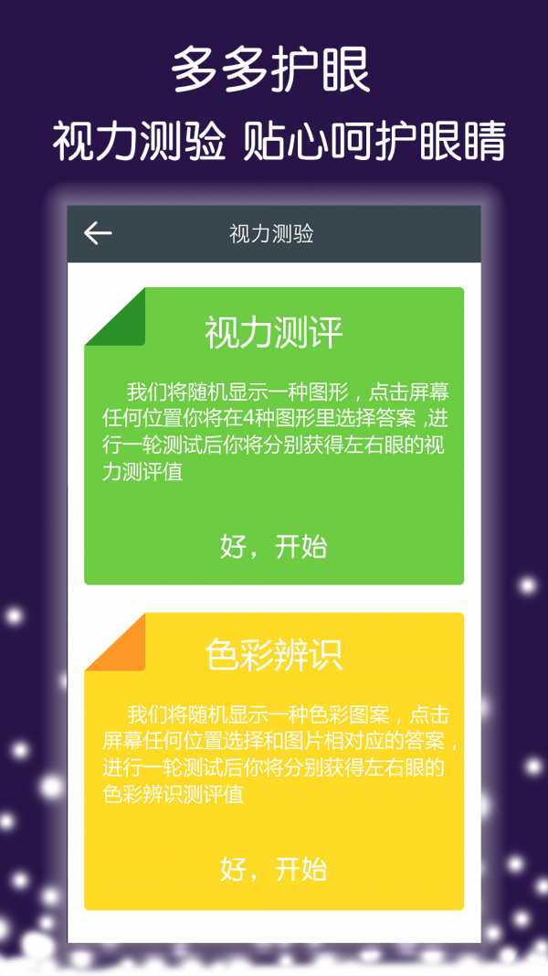 视力检测:使用专业测试视力方法,通过科学计算移植到手机屏幕,检测结果更有根据。