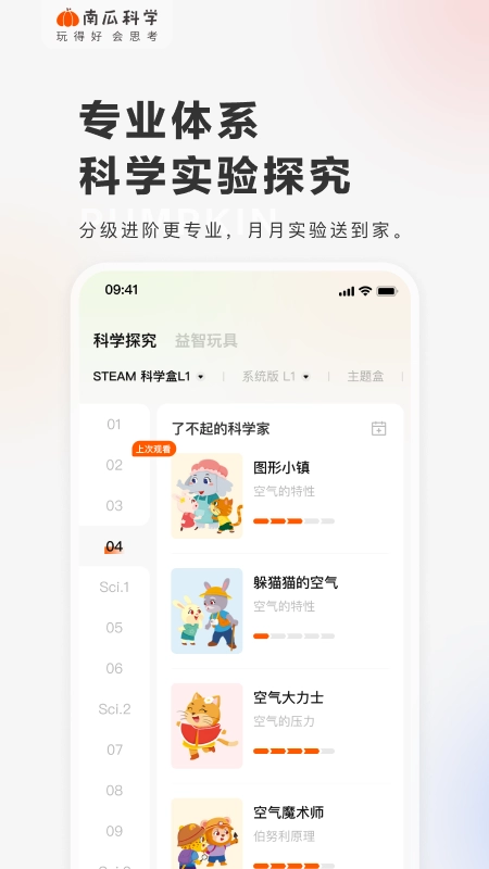 南瓜科学app是一款培养孩子科学思维能力的客户端应用,南瓜科学实验课上孩子可以接触到各种科学小实验,吸引孩子追寻科学真相,南瓜科学有效激发孩子探索能力。南瓜科学app支持家长与儿童之间的互动和交流。家长可以通过软件中的亲子活动或者特定科普材料,与孩子们一起探索科学世界,提高亲子之间的沟通和互动。