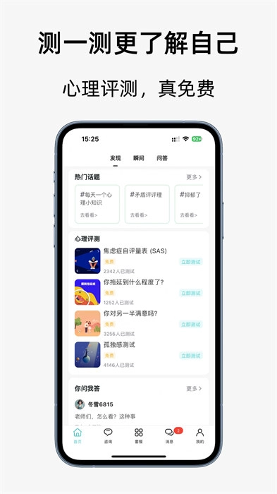 1、提供心理测试与评估功能,了解自己的情感状态,并获得相关建议和改善方案。