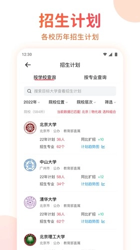 考生可根据学校名称,学校省份等搜索全国所有高校。