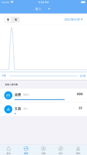 详细的账单信息会以图标的形式为用户呈现,并且账单页面显示统计数据;